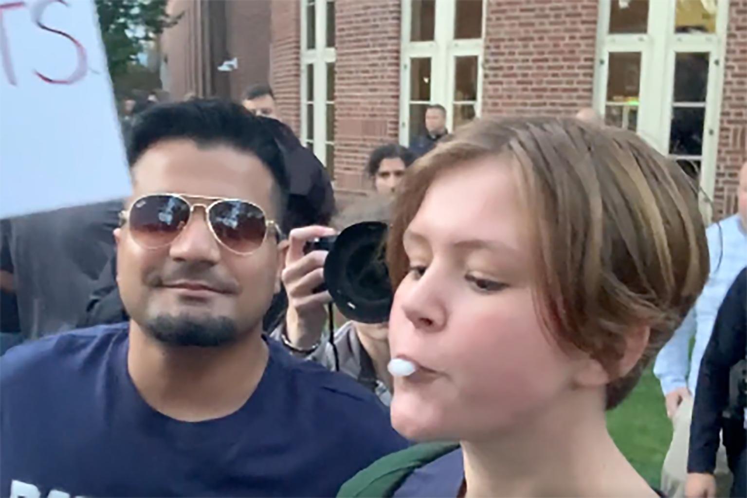 Shocking video footage caught an enraged woman spitting at right-wing provocateur Alex Stein as he mocked the protests that shut down his show at Penn State University.