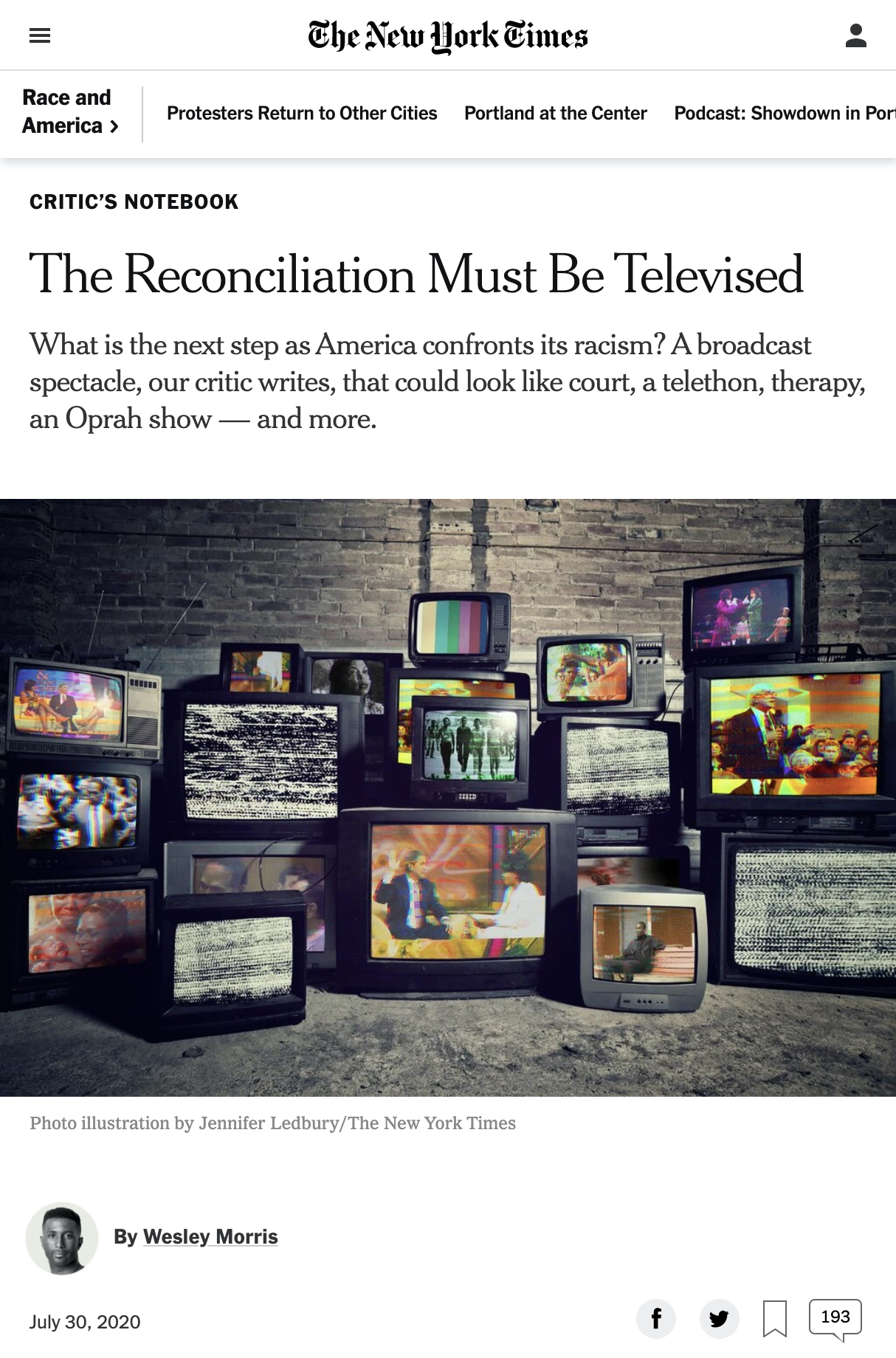 This reckoning event would in part entail stories of the ways in which the poison of racism has ruined lives and wrecked families…Then we’d hear from the officials and schemers who neglected and bilked them. Their confessors would be the likes of Oprah Winfrey, Gayle King, Terry Gross, Katie Couric, Trevor Noah, Brian Lehrer, Cheryl Strayed and Connie Chung, people who excel at listening, people whom Americans are used to listening to, people whose ears seem connected directly to their hearts. The listening feels important. So does the facilitation of dialogue. This makes someone like Winfrey critical to the undertaking. She is a pioneer of televised reckoning and remains a master facilitator.