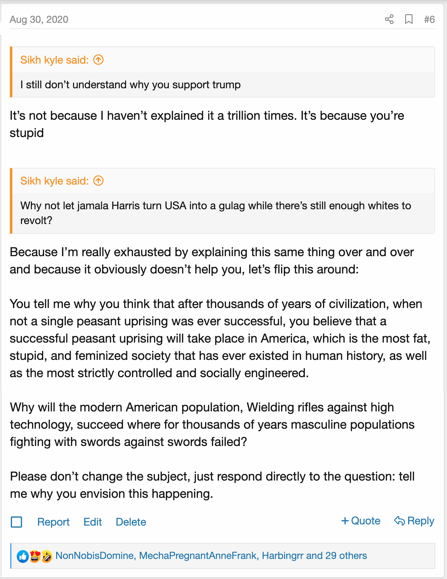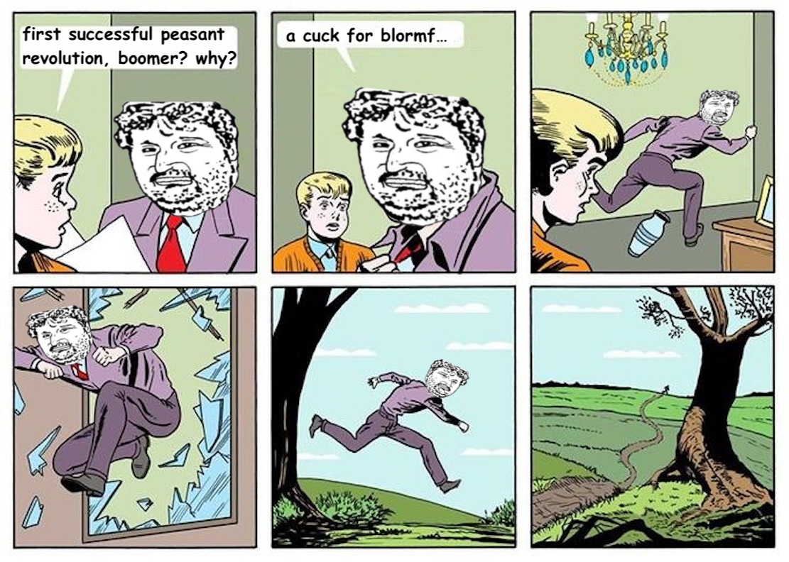 Ask one of these people why they believe that the most soyed-out, the most stupid and brainwashed, the fattest population in all of history will be the very first one to throw a successful peasant revolution. They will not give you an answer. They will change the subject, or just keep talking about how Trump loves Israel and you’re a cuck if you don’t vote for Kamala. Most of them will just quickly disappear.