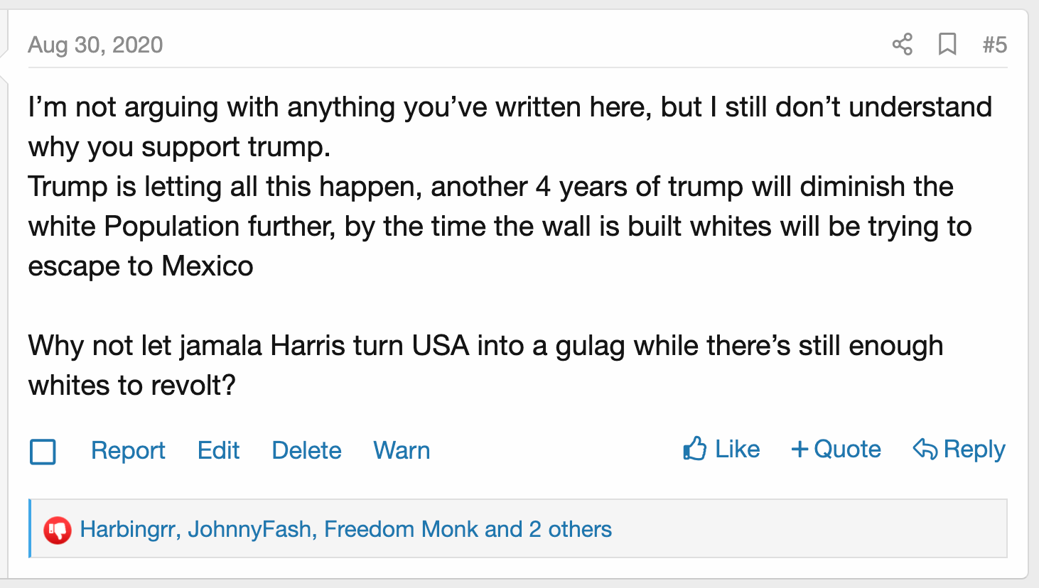 Right now, there are people in comments sections saying that they are not going to vote for Trump, they want Kamala to win, because they are sad that Trump is pro-Israel (or whatever). These are either literal FBI agents and Jews, or they are twisted, evil morons.