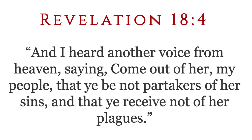 The fact of reality is that many of our countrymen want to partake in her sins, they do not fear her plagues. Watching the recent video I posted of a visit to an Antichrist church, I really realized how true this is. We have to allow those people to take this road that they’ve chosen. We have no more of a right to save them from destruction than they have to drag us down with them.