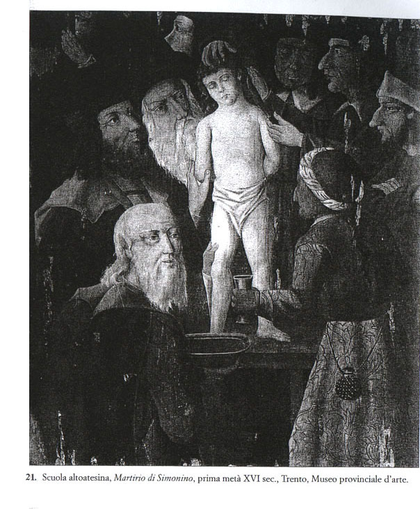 On the Sabbath right after little Simon’s murder, when the child’s body was placed on the almemor, the Jews of Trent, gathered in the synagogue, abandoned themselves to excessive gestures absolutely without inhibition or restraint. According to the deposition of Angelo da Verona’s servant, Lazzaro, Samuele da Nuremberg, after concluding his fiery anti-Christian sermon against Jesus and His Mother, rushed up to the almemor, and, after “doing the fig”, slapped the boy in the face and spat on him. Not to be outdone, Angelo de Verona imitated these outrageous gestures, spitting and slapping the corpse, while Mosè “the Old Man” of Würzburg “did the fig”, mockingly showing his teeth, while Maestro Tobias allowed himself to be carried away in the performance of other acts of violence, with no shortage of slapping and spitting.