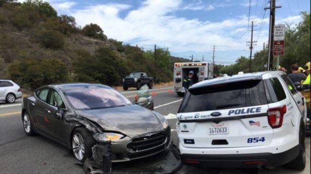 A Tesla Model S crashed into a parked police vehicle while reportedly driving on autopilot in Laguna Beach, California, injuring the Tesla driver and badly damaging the cop car.