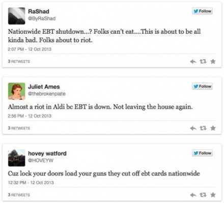 Conservative websites, continuing their pattern of dog-whistling racial angst to generate hits and ad revenue, had a field-day reporting on the Tweets by those adversely effected by the EBT glitch: EBT System Goes Down: Obama Voters Threaten Mass Riots, by Andrea Ryan, TheGateWaypundit.Com, October 12, 2013