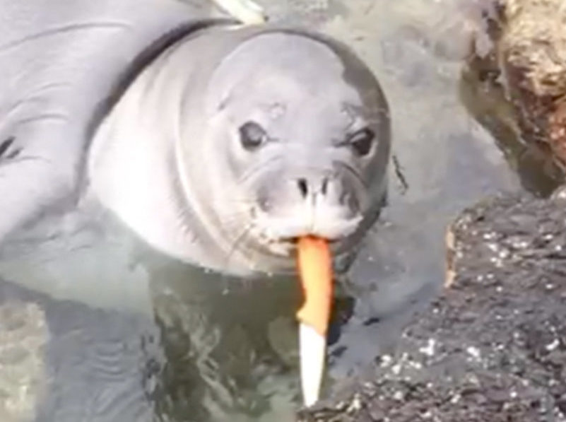 At one point the seal dropped the knife under the rocks and it was later retrieved.