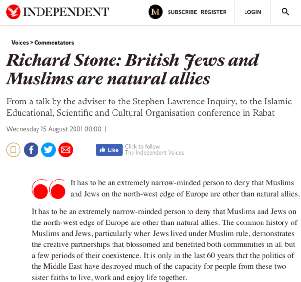 It seems an overwhelmingly strong probability that Richard Stone was therefore the person who launched “Islamophobia” on its meteoric career, all the more so in that the need for Jewish/Muslim cooperation against the goyim/kuffar had been one of his lifelong obsessions.