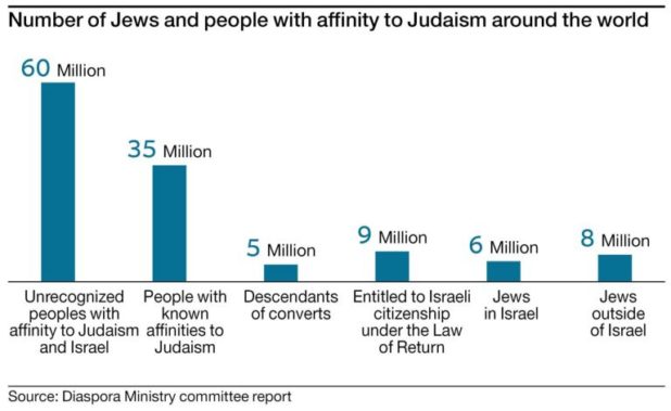 A committee appointed by Israel’s Diaspora Affairs minister says that there are some 60 million people around the world with an “affinity” to Judaism or Israel. The committee says that among them there are communities that could be brought to Israel and converted to Judaism. The committee’s recommendations call for reaching out to these communities and introducing them to content related to Israel and Judaism.