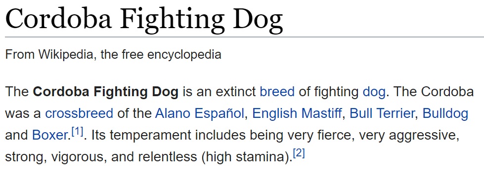 Ah, scratch that. It’s based on the Cordoba Fighting Dog, a Frankenstein-type combination of all the most fierce and aggressive dog breeds meant for tearing other dogs apart in illegal underground dog-fighting arenas. The breed went extinct because they all died in the dog-fighting pits.