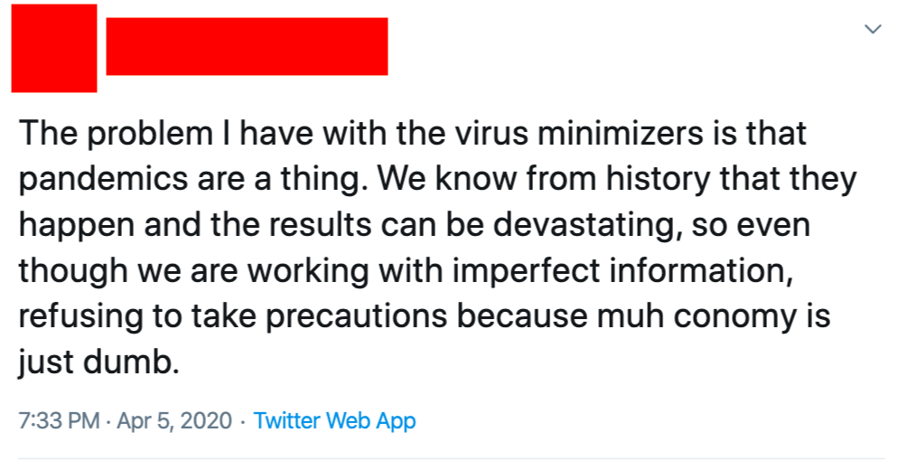 I recently came across a tweet from a right-wing blogger I hadn’t heard from in a while, who I’d always taken to be a pretty sharp guy. As it turns out, he’s in a state of coronavirus hysteria, and is lashing out against anyone who doesn’t “believe” in the virus.