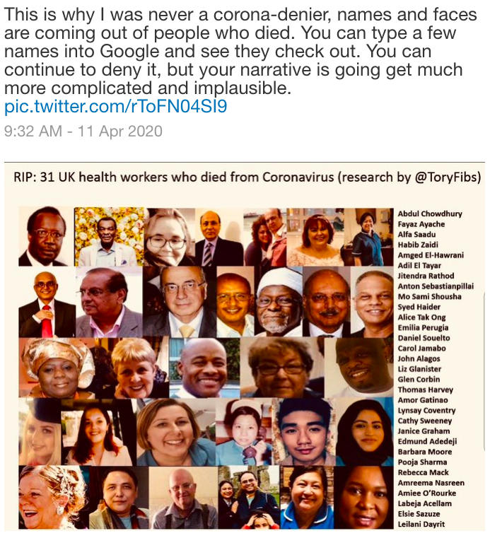 This person went so far as to post pictures of people who have died and claim that people who don’t believe the media on this think that no one is actually dying…!