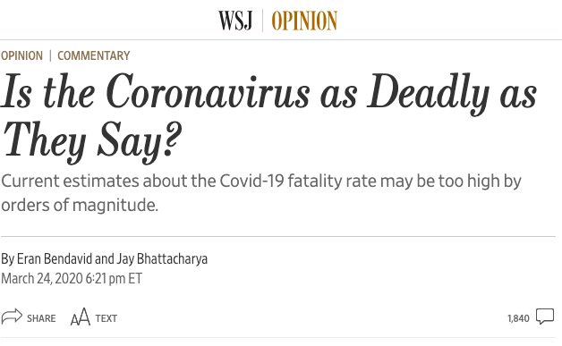 Many other prominent authorities have spoken out against this hoax, including two other professors from Stanford, Eran Bendavid and Jay Bhattacharya, who published a March 24 op-ed in the Wall Street Journal about the dishonest way in which the denominator of the morbidity rate was being manipulated, and came to the conclusion that the real number was the same as any other flu.