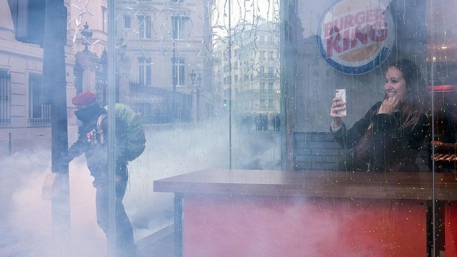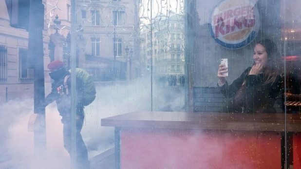As “urban warfare” grips the streets of Paris a photograph of a woman in a Burger King, who is incongruously grinning from ear to ear while tear gas swirls outside, is being hailed as the perfect encapsulation of modern times.