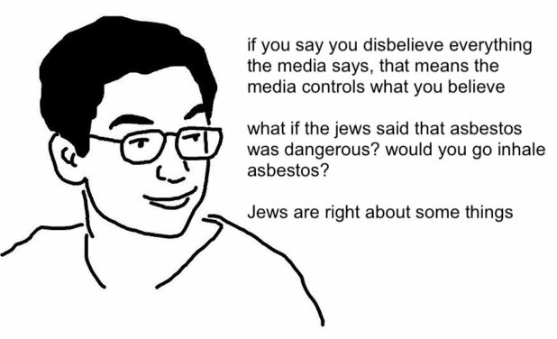 Firstly, that’s retarded. Secondly, if Jews started running nonstop headlines in all media about how dangerous asbestos is – if I saw “Asbestos danger!” at the top of the New York Times, and CNN’s Jake Tapper was doing special reports on the dangers of asbestos – yes, actually, that would give me pause.