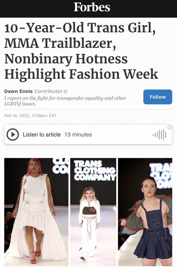 Yes – Forbes, in an article written by one Dawn Ennis, used the word “hotness” to describe a 10-year-old boy dressed up like a girl!