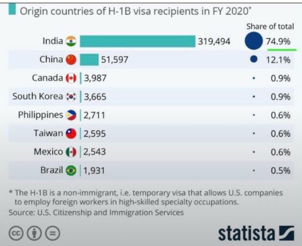 The biggest H-1B visa winners are largely Indian IT outsourcing firms — Cognizant, Tata, Infosys, HCL — that specialize not in innovation or new tech, but in labor arbitrage: lower paid IT workers as contractors. These firms generate billions then lobby for more lax visa rules.