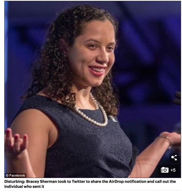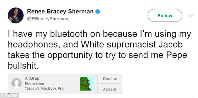 Renee Bracey Sherman, 31, a reproductive rights activist, said she was awaiting a delayed flight in Washington, D.C. when she received an unusual notification on her laptop: a stranger named Jacob was attempting to share an image of Pepe the Frog with her via AirDrop, Apple’s Bluetooth connectivity system.