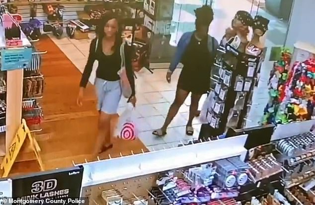 Shocking surveillance footage from Wheaton Beauty Supply Store shows the women enter the shop holding Target bags then pick up merchandise from the shelves. One woman is seen putting an item into the Target bag.