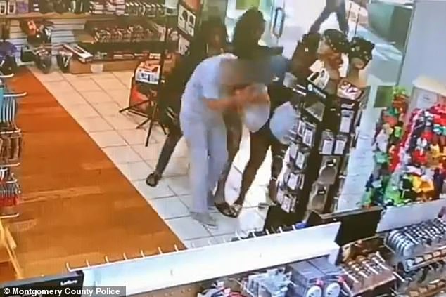 One woman with long braids and wearing a denim jacket attacks him across the store throwing an endless stream of punches and has to be restrained by her friend and another shopper at the store.