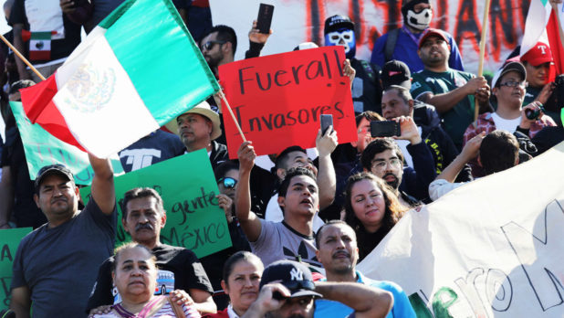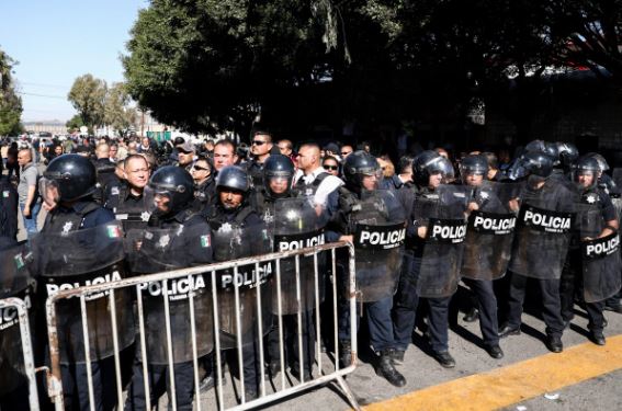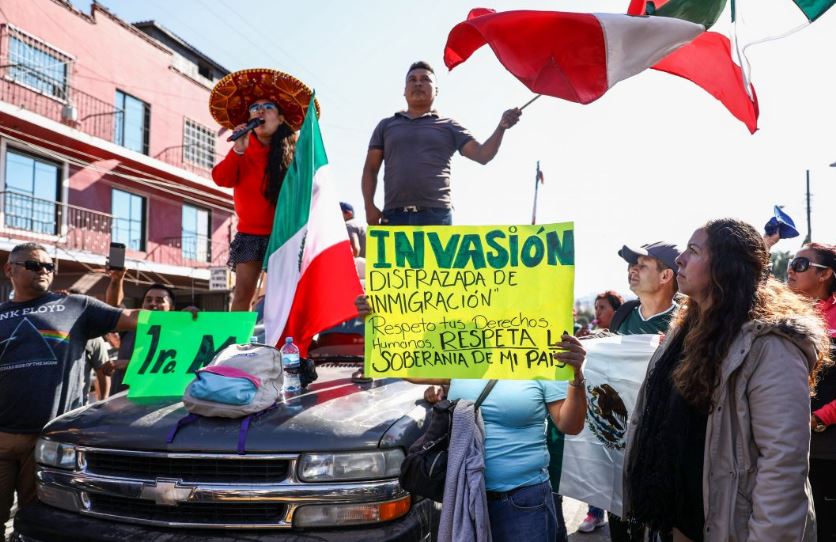 On Sunday, anti-caravan protesters clashed with riot police near the shelter, vowing to “sacar los migrantes de allí” (“get the migrants out of there”). Migrants at the shelter were kept on lockdown for hours while protesters overturned concrete barriers put in place for crowd control and threw plastic bottles and trash at a helmeted line of police with riot shields.