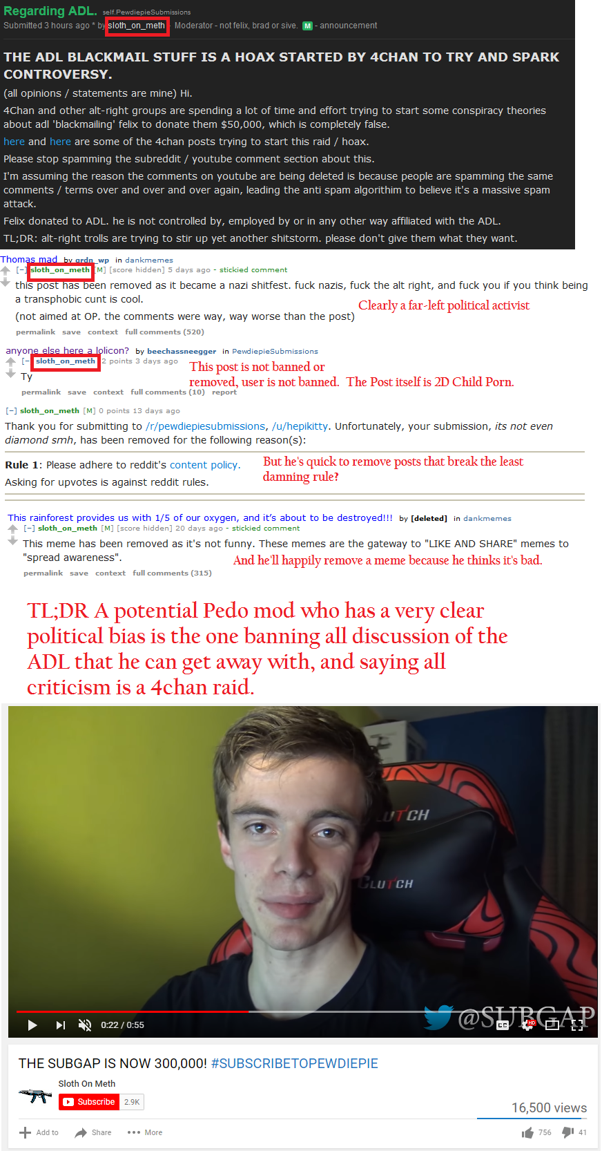 Anyways, someone should probably do something about this Sloth guy. I know it’s Reddit and Reddit is completely run by these sick perverts, but you’d think Felix would show some concern over who he allows his 9-year-old army to be modded by in his name. Or maybe this is the new direction that PewDiePie wants to go in, idk.