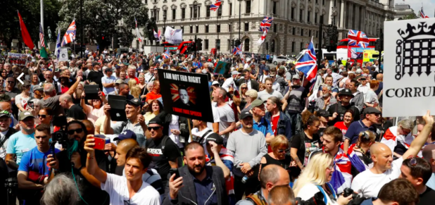 Robinson’s supporters, who had gathered outside the Old Bailey for his sentencing hearing today, marched through the streets of London to Parliament Square.