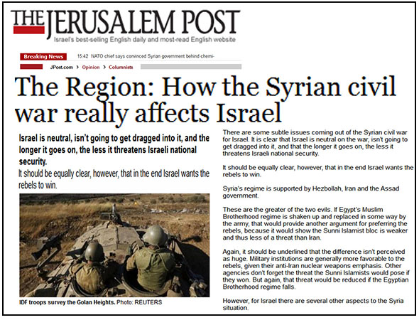His remarks confirm an earlier assessment published by the Jerusalem Post, titled “The Region: How the Syrian civil war really affects Israel.”