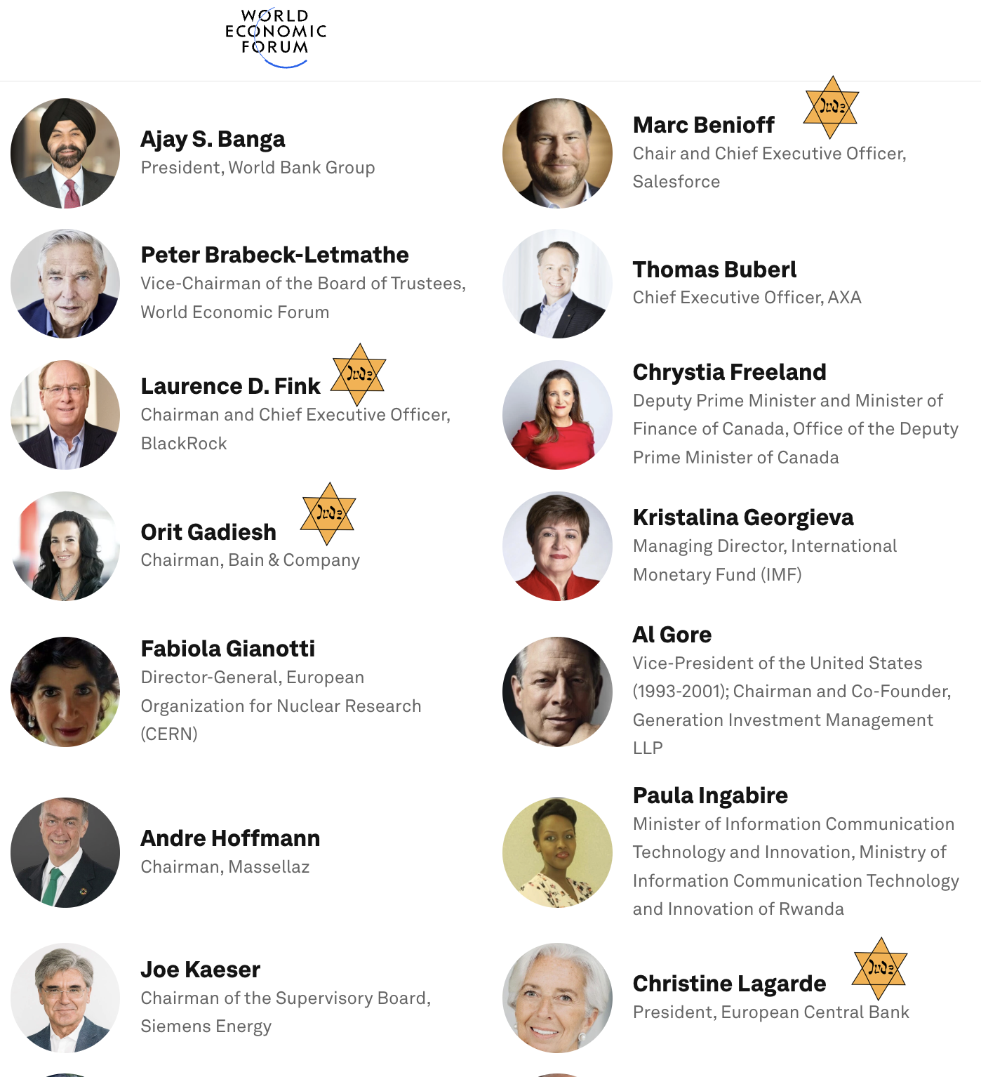 I’ve always intended to go through their “leadership and governance” page and see what percent is Jewish, but if you just peruse it, you’ll see that this is a Jewish group. The most influential person at the organization is Larry Fink (BlackRock), the second most influential is Marc Benioff (Salesforce), then you’ve got Christine Lagarde (IMF, European Central Bank), and on and on. The non-Jews are all from Jew-occupied countries, and most of them have Jewish spouses.