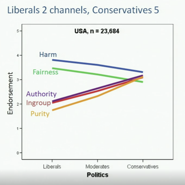 The right will always view things in terms of in-group and out-group, which naturally leads to racism and nationalism. Conversely, the left, with their extreme prioritization of fairness, believes that all people on earth are the same, and therefore if one group is more successful, they should be punished for that success in order to level the playing field.
