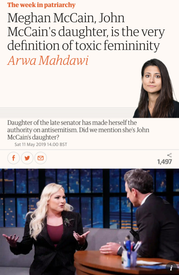 Arwa goes into McCain’s irate recent appearance on the talkshow of the Jew Seth Meyers, wherein this fat hoe flew off the handle and started screaming about the Ilhan Omar threat to the Jews, before getting to the interesting bit about toxic femininity, which I am shocked made it through her editor.