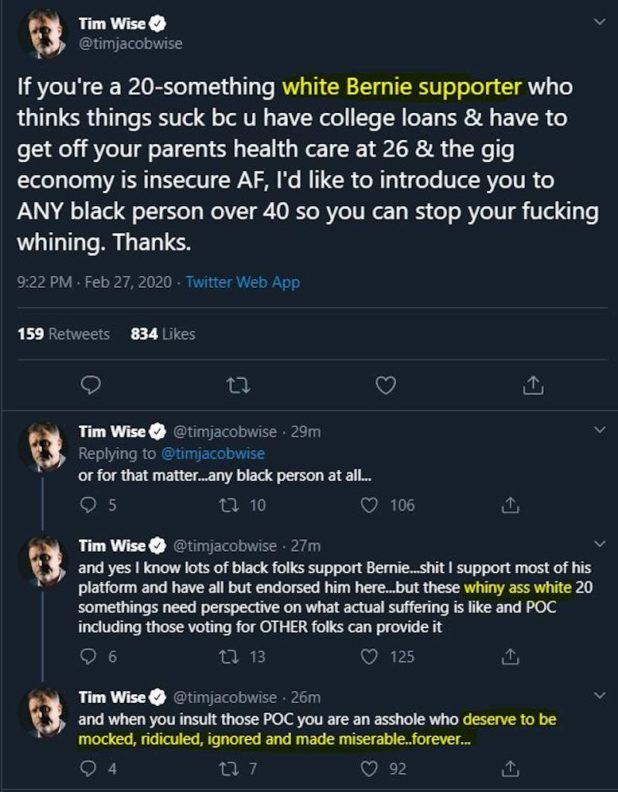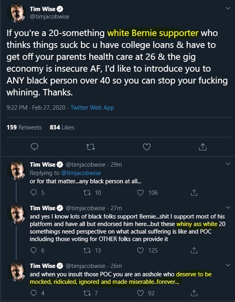 Weiss is claiming that Bernie is evil because white people support him.