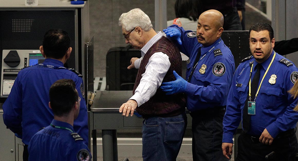 And the Boomer is having a hard time getting through. The full body scan has revealed something. He chuckles haplessly. He’s sent through the metal detector. Nothing. Through the body scanner again. He’s grinning from ear to ear now. And then the fat sheeboon starts using the wand.
