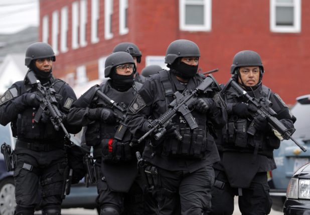 Also, they are increasingly non-White. This photo is from the man-hunt for the Tsarnaev’s in Boston (Boston is still 50% white, but whites don’t represent 50% of their police force).