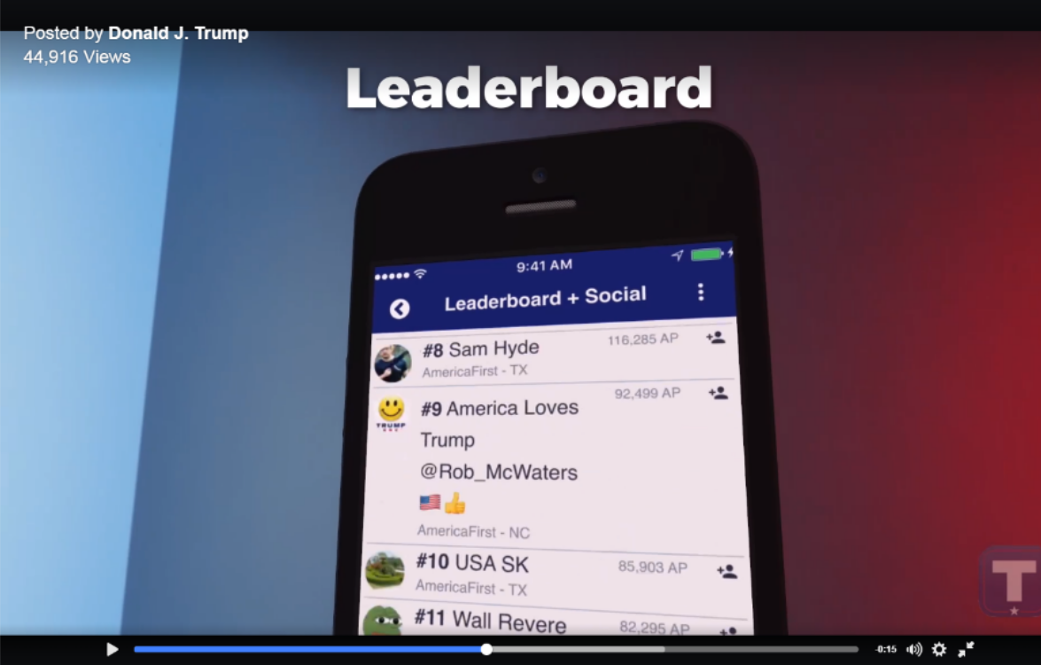 Other social features include gamification where more participation lets users can get go up levels. The eight levels are called: Apprentice, Patriot, TrumpTrain, TeamTrump, TrumpForce1, AmericaFirst, MAGA and BigLeague.