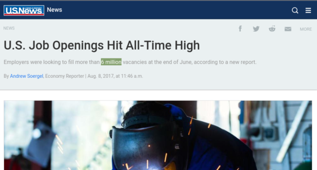 Nearly 6.2 million positions were up for grabs in June, up considerably from May’s 5.7 million openings and soaring past July 2016’s record of 5.97 million vacancies. Leading the way were sectors like construction, professional and business services, and trade, transportation and utilities – all of which posted their highest levels of vacancies since July of last year.