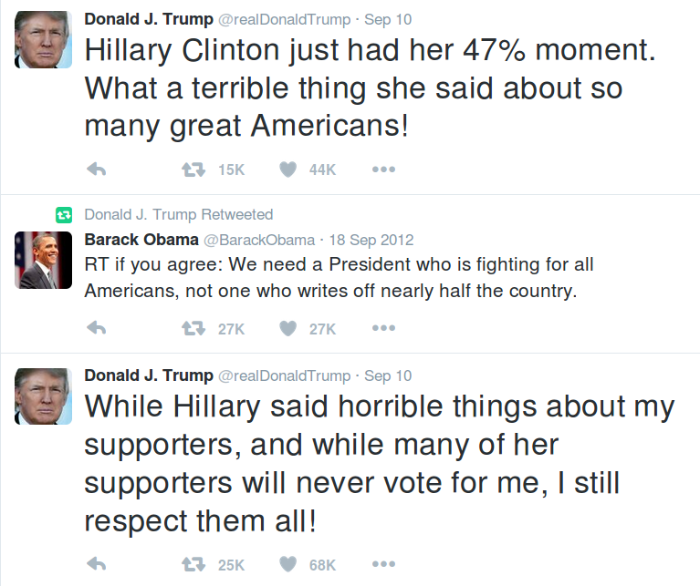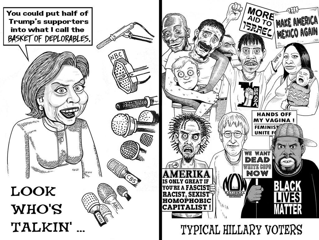 The media is implying That the Donald is hypocritical here, because he “insults” large groups of people all the time, while being outraged that Hillary is doing the same. But there’s actually a very important distinction to be made here. Trump makes disparaging remarks about non-Americans – to people who in principle don’t belong in America, and whom the President doesn’t represent. But Hillary is insulting the very people she’s supposed to represent.