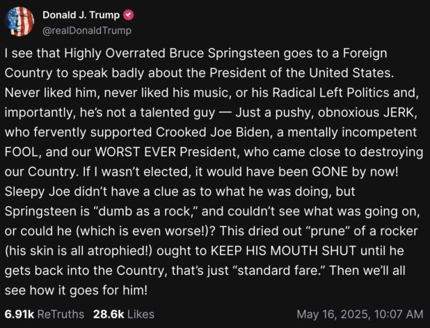Trump should also start playing “Born in the USA” at his rallies and wait for Bruce to sue then say he’s overruling the Supreme Court and going to keep playing it. He should actually play “Lost in the Flood,” because “Born in the USA” actually is overrated.