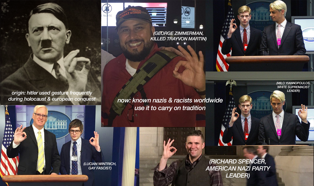 The gesture – which only makes sense if made with the right hand, although there are examples of people making it with their left hand – is said to depict the letter ‘W’ with the outstretched middle, ring and little fingers, and a ‘P’ with the circle made by the thumb and forefinger stretching down to the wrist. Together ‘WP’ stands for White Power.