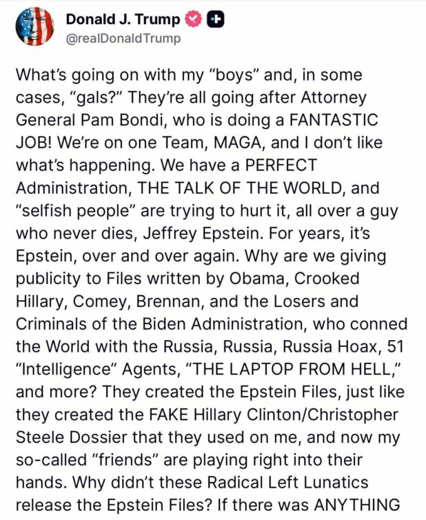 He attacks his supporters – calling them “my supporters” – and says that he won’t forget those who are talking about Epstein.