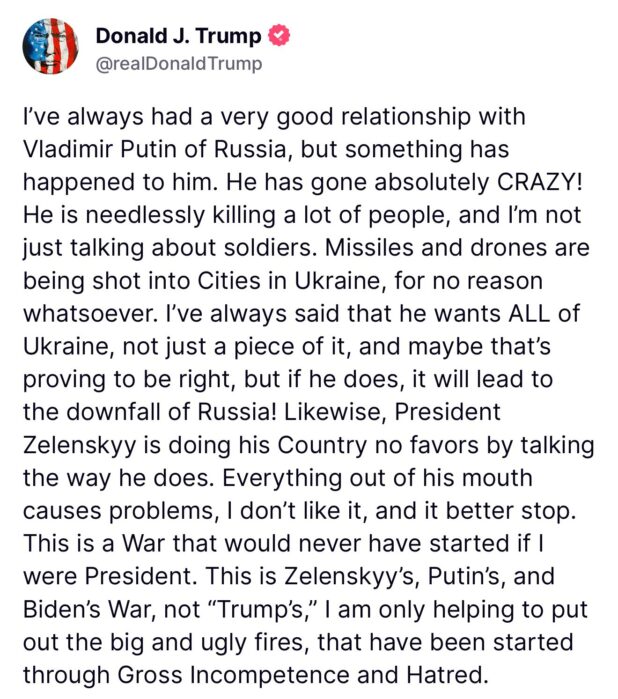 He campaigned on saying Joe Biden was right about Israel-Palestine but just wasn’t extreme enough. Everyone knew that was his position. However he now does seem to be bothered by the fact that all of his supporters, save whatever evangelical boomers are still around, view him as a puppet of Netanyahu who is personally responsible for a genocide. It’s possible he can’t get out of that, as he actually is just totally controlled by Israel. But if he can, why not take the PR win and end the Ukraine war? Why go around spewing gibberish that no adult takes seriously?