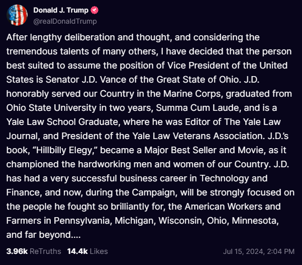 Here’s the official announcement, via “Truth Social”: