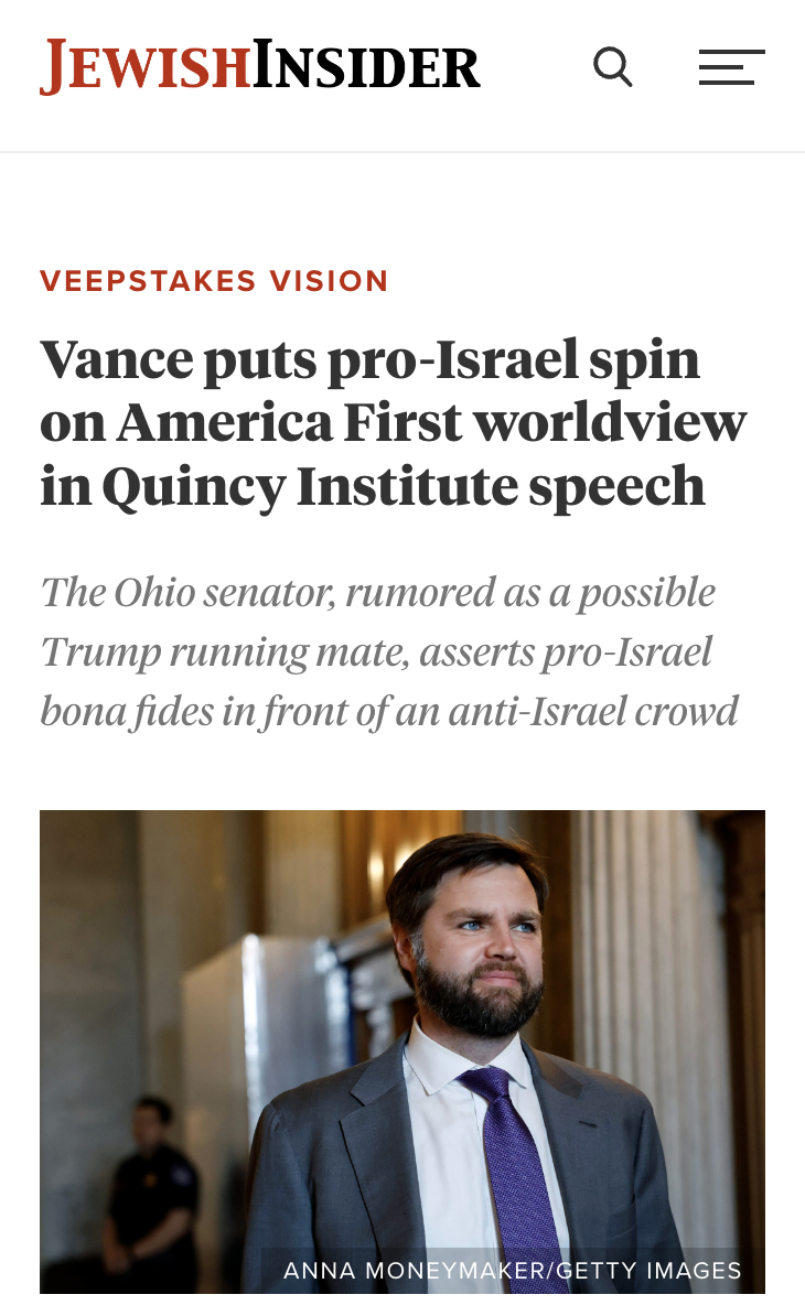 Vance’s criticism of US policy does not include questioning US support for Israel. At the Quincy Institute speech, he made the case that Israel differs from Ukraine in terms of US aid.