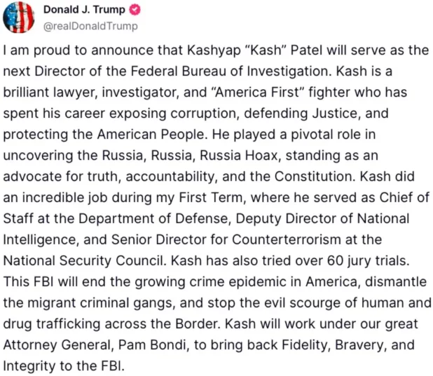Donald Trump has selected pro-Israel sycophant Kash Patel for FBI Director: