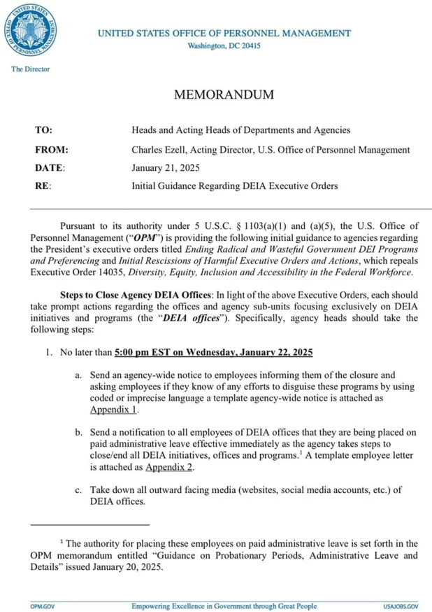 The Office of Personnel Management in a Tuesday memo directed agencies to place DEI office staffers on paid leave by 5 p.m. Wednesday and take down all public DEI-focused webpages by the same deadline. Several federal departments had removed the webpages even before the memorandum. Agencies must also cancel any DEI-related training and end any related contracts, and federal workers are being asked to report to Trump’s Office of Personnel Management if they suspect any DEI-related program has been renamed to obfuscate its purpose within 10 days or face “adverse consequences.”