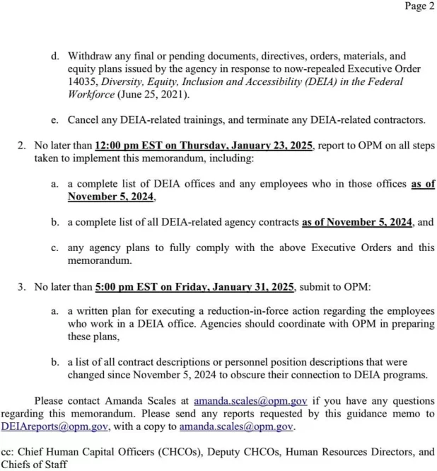 By Thursday, federal agencies are directed to compile a list of federal DEI offices and workers as of Election Day. By next Friday, they are expected to develop a plan to execute a “reduction-in-force action” against those federal workers.