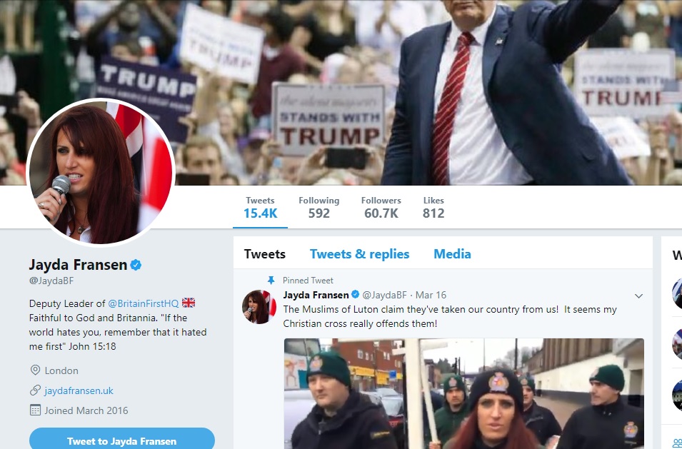 Jayda Fransen is the deputy leader for Britain First, a civic nationalist party in Britain advocating for immigration restriction, especially of Moslems.