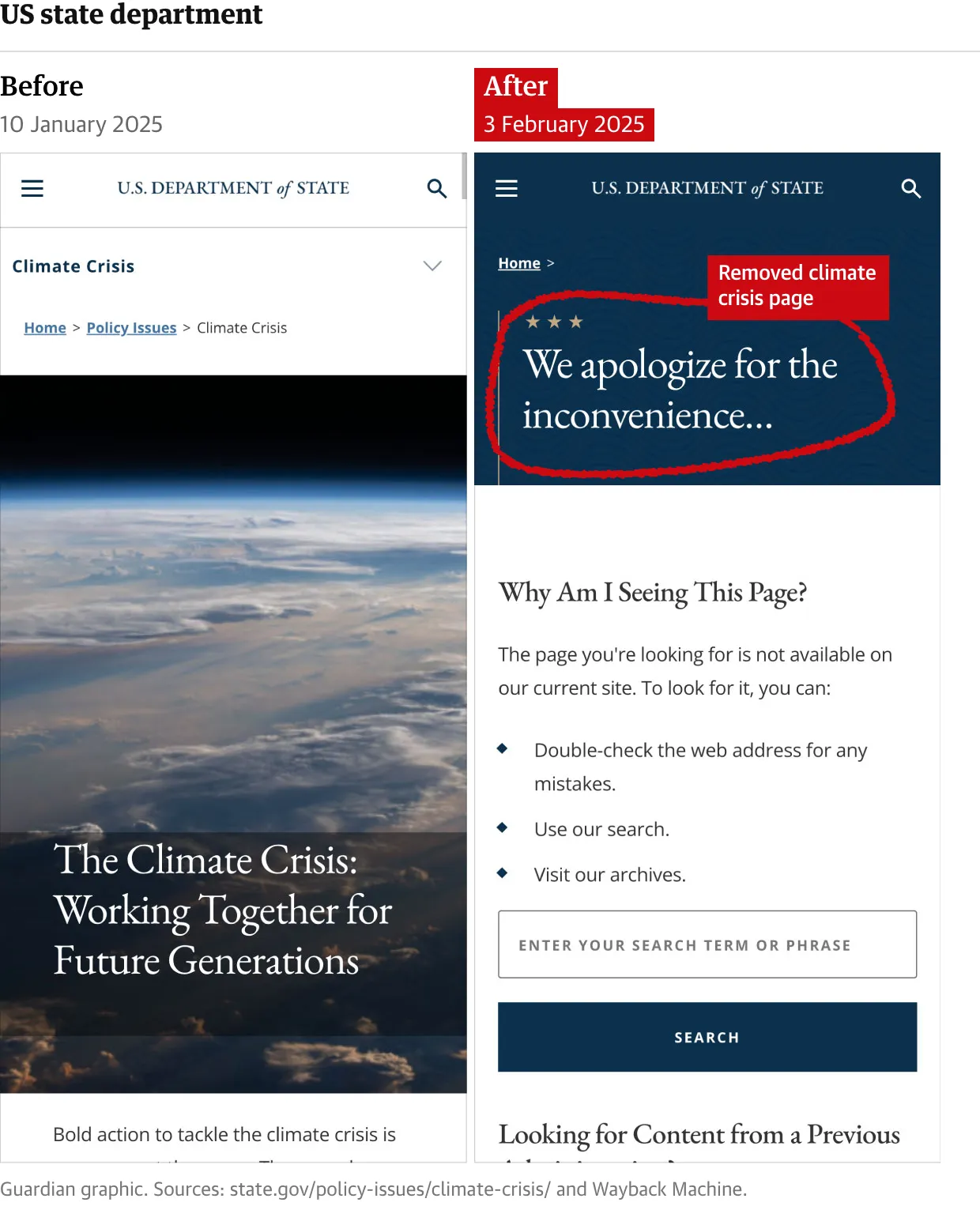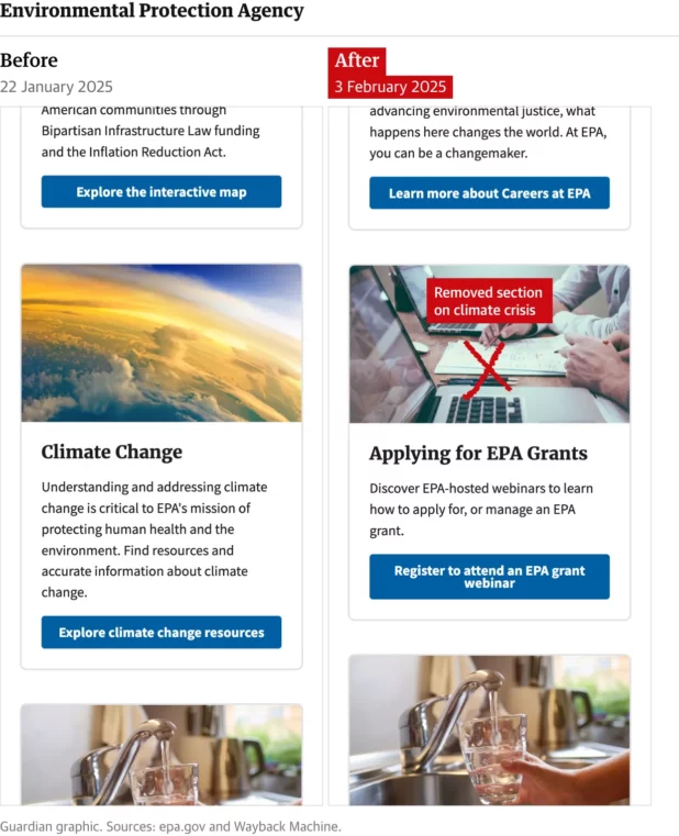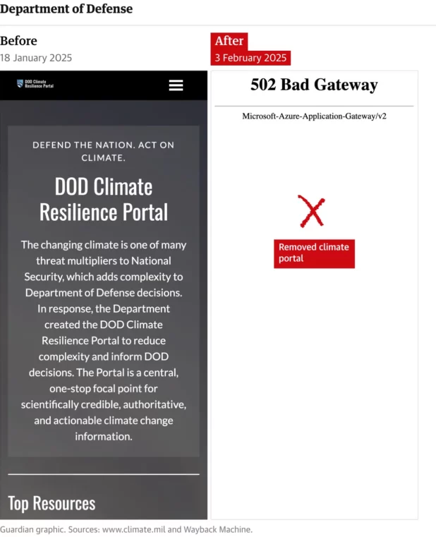 A major climate portal on the Department of Defense’s website has been scrapped, as has the main climate change section on the site of the Department of State. A climate change page on the White House’s website no longer exists, nor does climate content provided by the US agriculture department, including information that provides vulnerability assessments for wildfires.