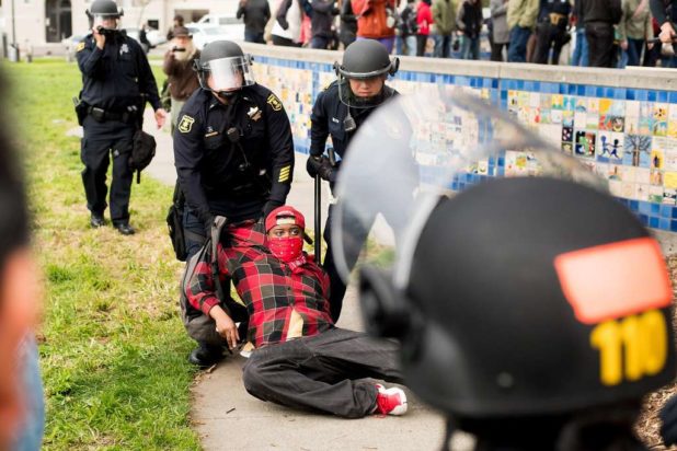 By 3 p.m., the self-proclaimed anarchists were dominating the crowd. Dressed all in black and wearing cloth bandannas over their faces, they stopped traffic as they marched from the park through downtown with the smaller mix of Trump supporters and counterprotesters. In the park, people opposed to Trump threw eggs and burned both American flags and the red “Make America Great Again” Trump campaign hats.