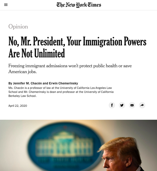 The op-ed by Jennifer M. Chacón and Erwin Chemerinsky (both of whom appear to be Jewish) says that Trump is violating the law by blocking any immigration. That obviously isn’t true, but imagine the New York Times Jews, who were the driving force behind completely abolishing the Constitution because of the flu, talking about the law.
