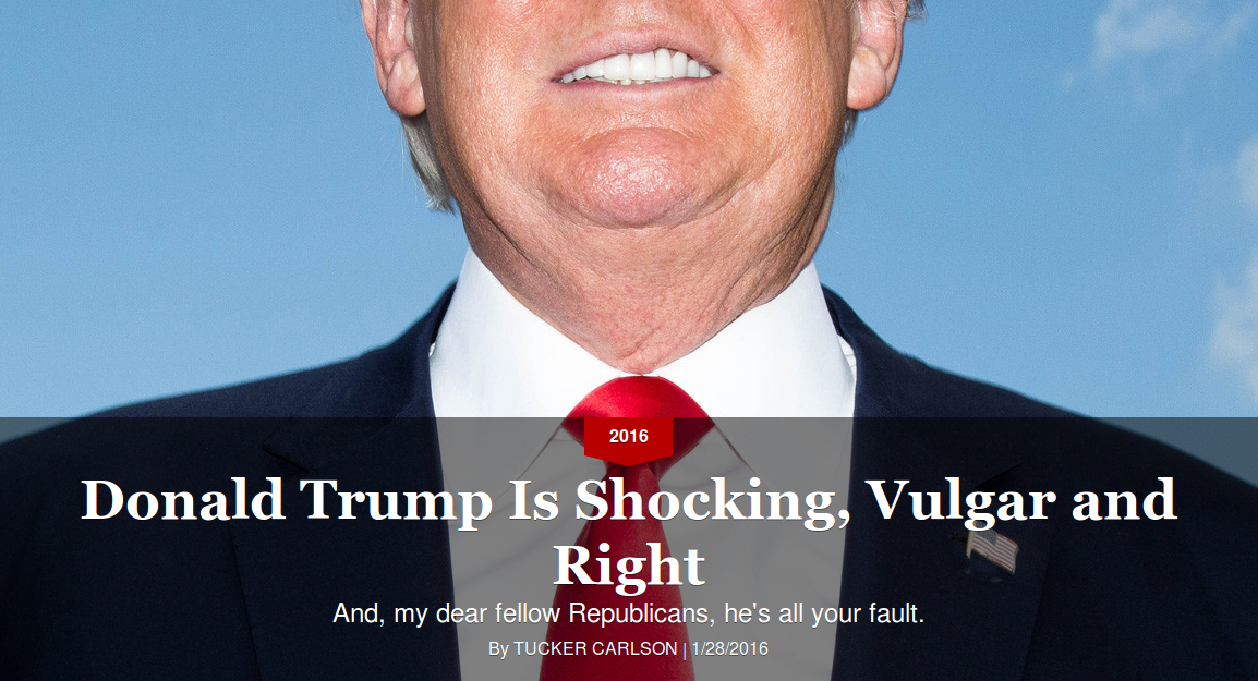 Tucker Carlson, a former Fox News host and founder and editor of The Daily Caller, has written a fantastic piece for Politico entitled “Donald Trump Is Shocking, Vulgar and Right,” which, while not being a full-on endorsement, is very close to being one.
