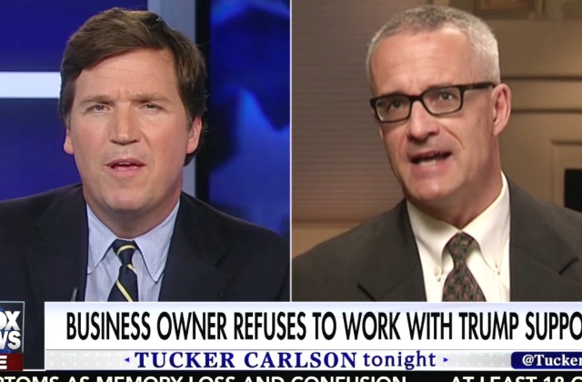 CARLSON: That is awful. Any normal person would not agree with any of that. But also, if you are decrying the climate of rage and intolerance, aren’t you adding to it? You’re saying you won’t do business with Trump supporters. Would you have them into your home? Would you eat with them, use the same water fountain as you do?